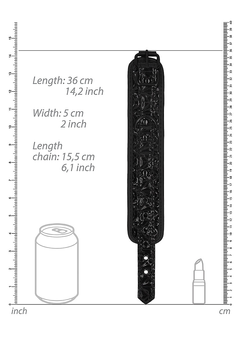 Enrich your BDSM play with these elegant yet super strong handcuffs! With 6 adjustable holes they will always guarantee a secure and snug fit while measuring from 21 cm (8.3") to 31 cm (12.2"). The tough black connection chain, measuring 15,5 cm (6.1"), comes with a lobster clasp for easy attachment and detachment. With their fashionable diamond pattern, these neoprene and faux-leather cuffs will look fantastic in any BDSM collection!