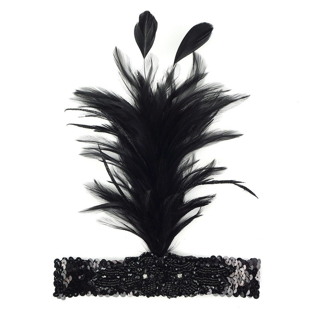 This Flapper Headband is made with a 7-8 inch tall dazzling hackle and goose feather stem giving it a classic art deco, Vaudeville or Cabaret look. This feather headpiece is an elegant women's accessory for roaring 1920s Gatsby themed parties, Halloween, Holidays and more.. Made with a beaded applique and 1 inch wide black elastic sequence band, the goose biot feathers are covered in black glitter for a little extra pizzazz. One size fits most and is very comfortable to wear during any party or event.